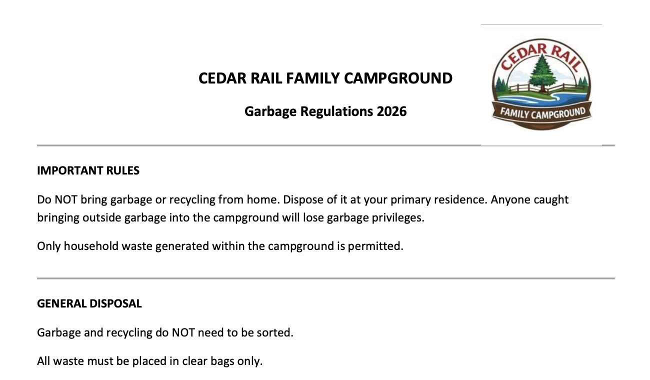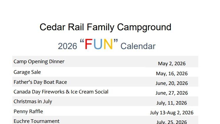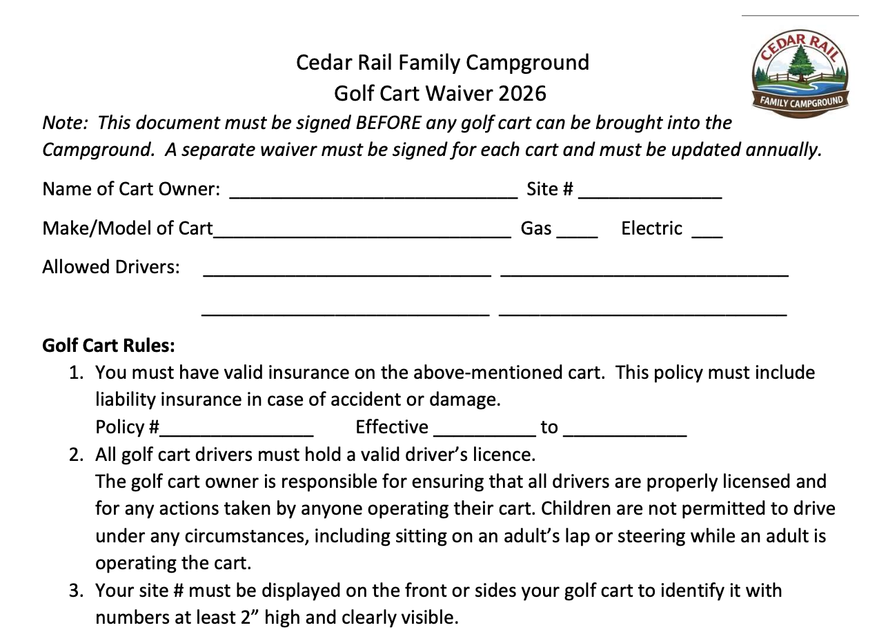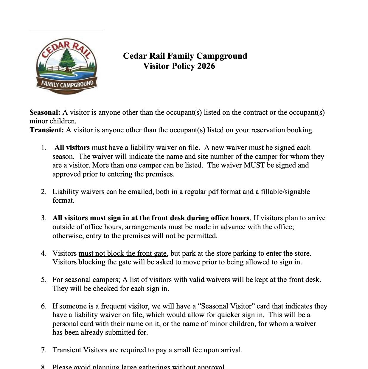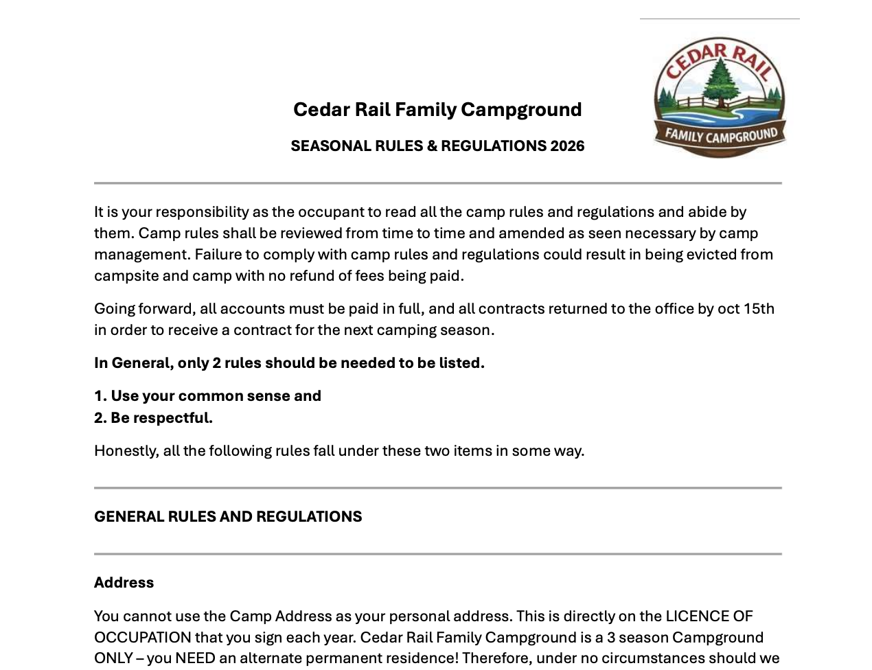 Downloads Rules & Regulations Download Seasonal Waiver Form - Adult Download Seasonal Waiver Form - Minor Download Visitor Policy Download Pet Policy Download Price List Download Golf Cart Waiver Download Cancellation Policy Download Rates Download Garbage Regulations Download FUN Calendar 2026 Download Camp Map Download