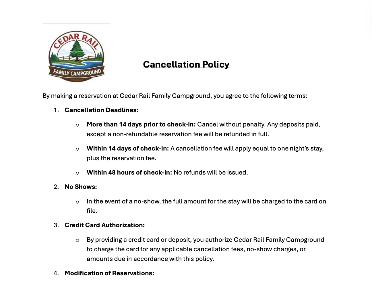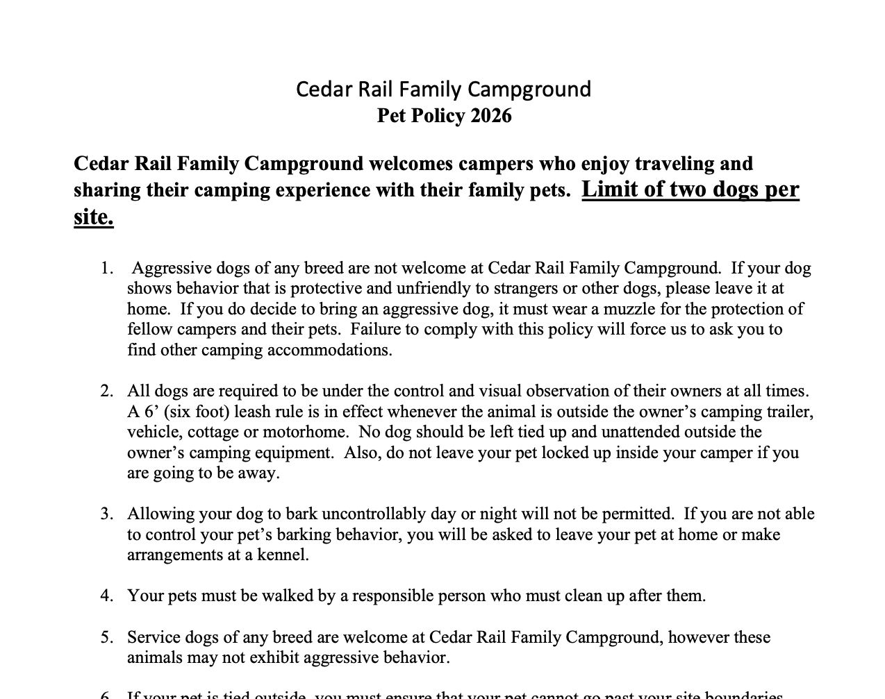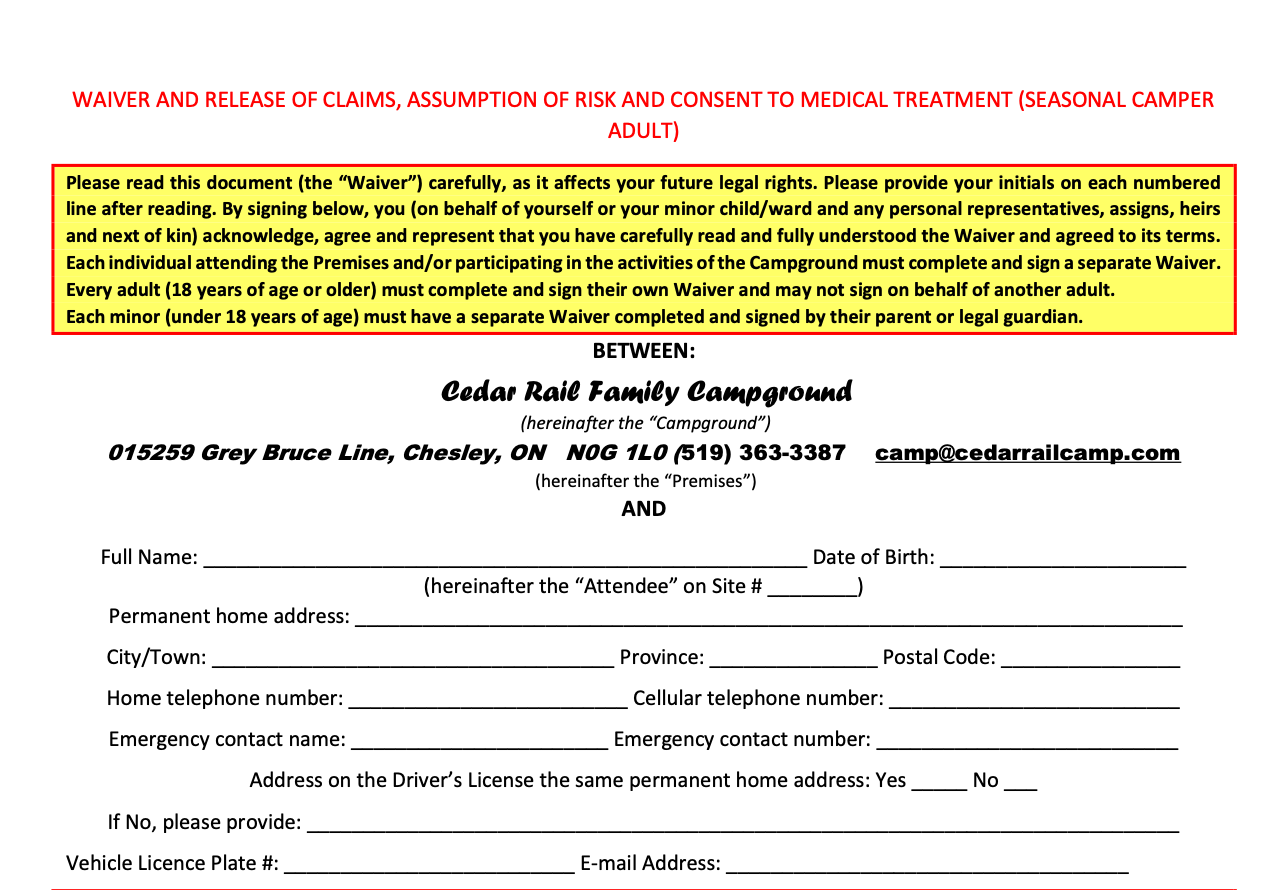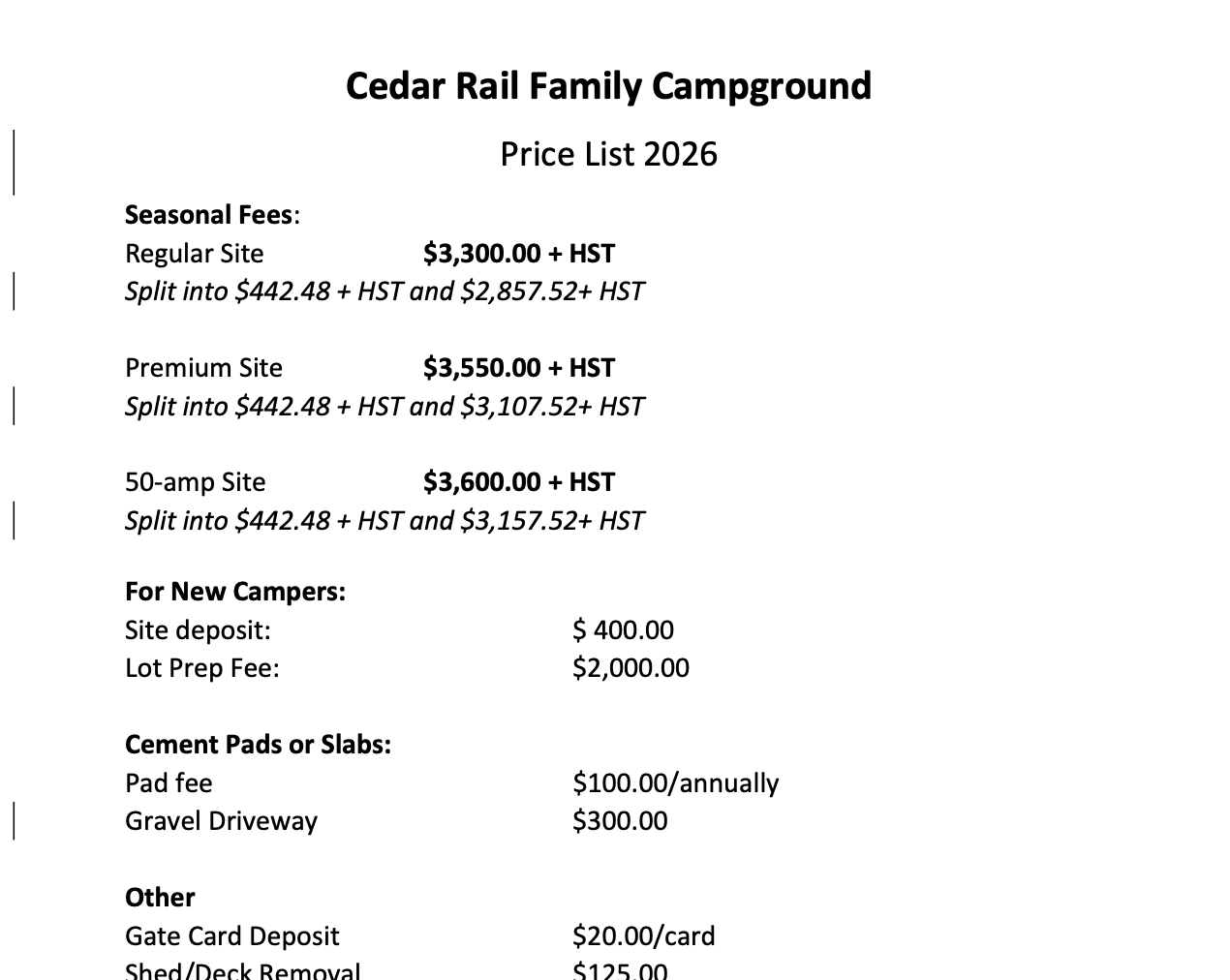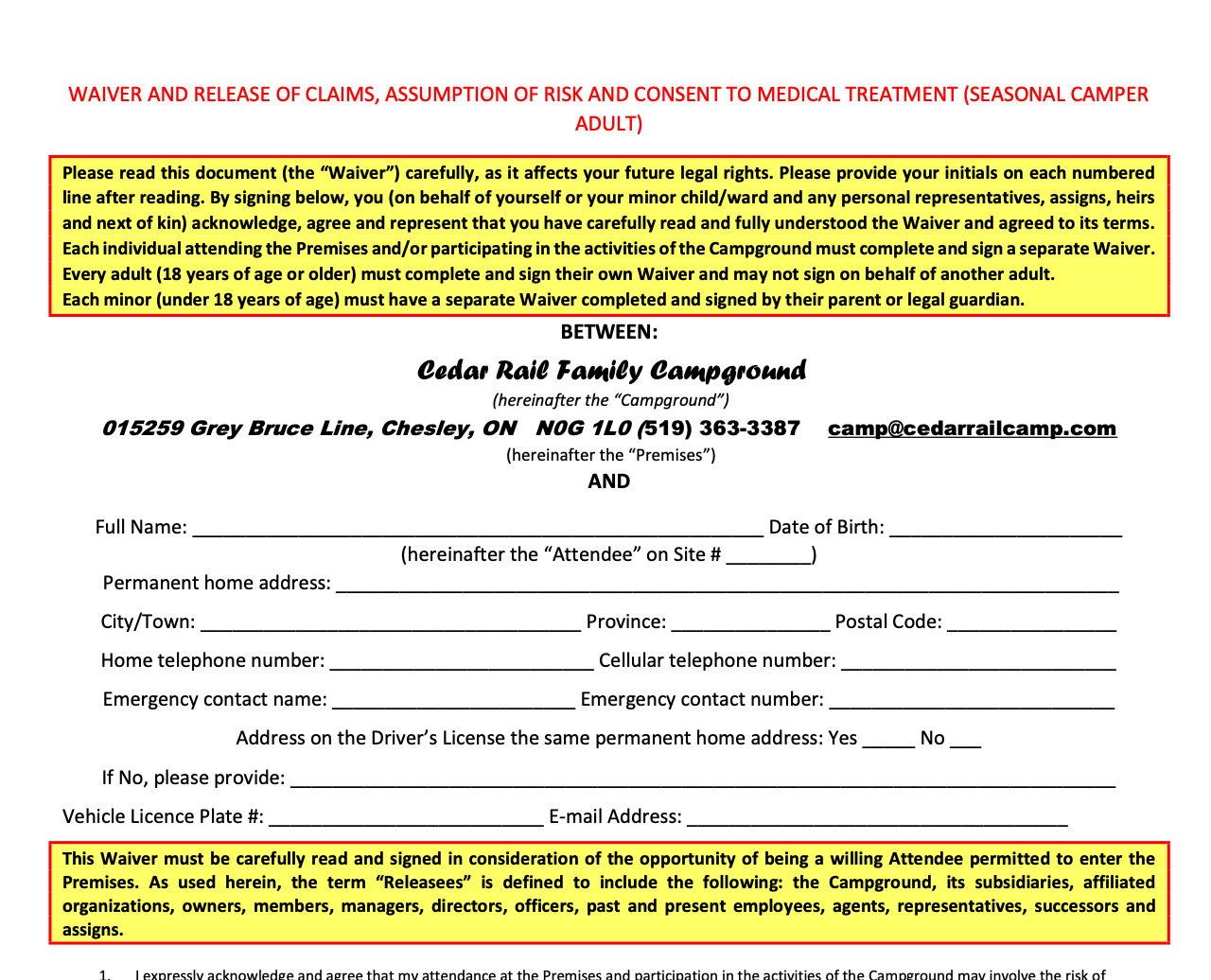 Downloads Rules & Regulations Download Seasonal Waiver Form - Adult Download Seasonal Waiver Form - Minor Download Visitor Policy Download Pet Policy Download Price List Download Golf Cart Waiver Download Cancellation Policy Download Rates Download Garbage Regulations Download FUN Calendar 2026 Download Camp Map Download
